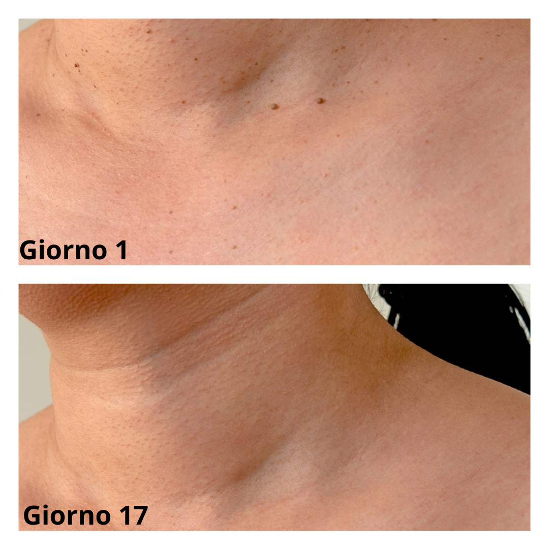 Avevo dei fibromi sul collo che mi davano fastidio da anni. Con questo kit sono caduti dopo pochi giorni, senza dolore e senza cicatrici. Finalmente posso indossare scollature senza imbarazzo!